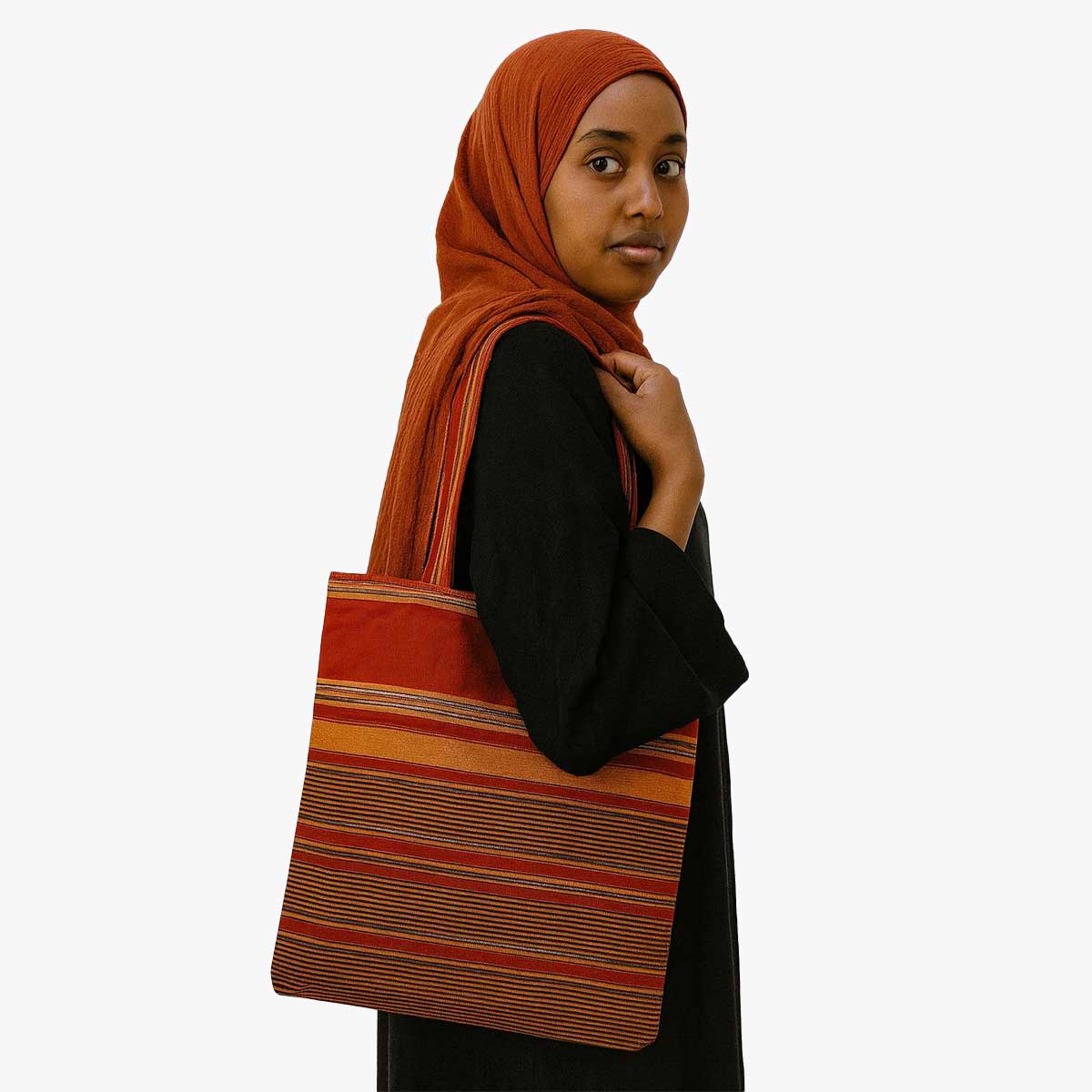 A beautifully crafted red and gold striped tote bag made from traditional handwoven fabric. Spacious and lightweight, it’s perfect for shopping, books, work, or daily use. The long handles provide comfortable shoulder carry.